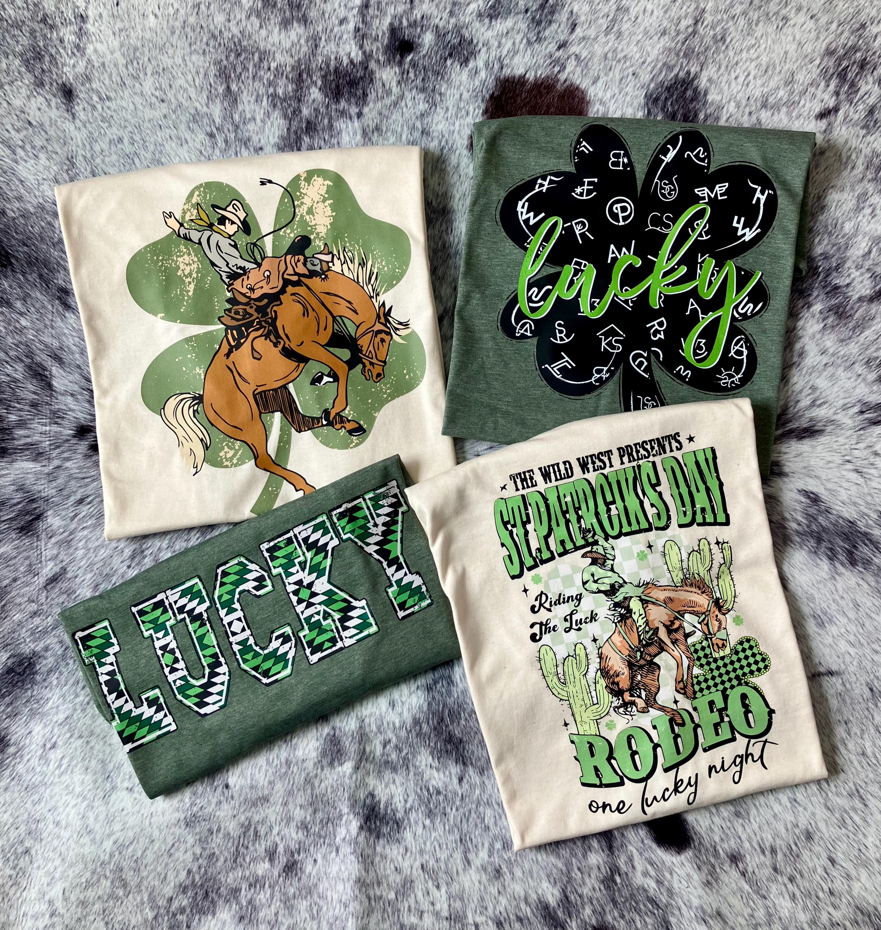 This western St. Patrick’s Day tee features a bold bucking horse graphic with lucky green accents, blending rodeo grit with festive charm. Printed on a soft, comfortable cream t-shirt. The relaxed fit makes it perfect for everyday wear, and the western artwork keeps it timeless long after March is over. Style it with jeans, boots, or layer it under a jacket for cooler spring days.