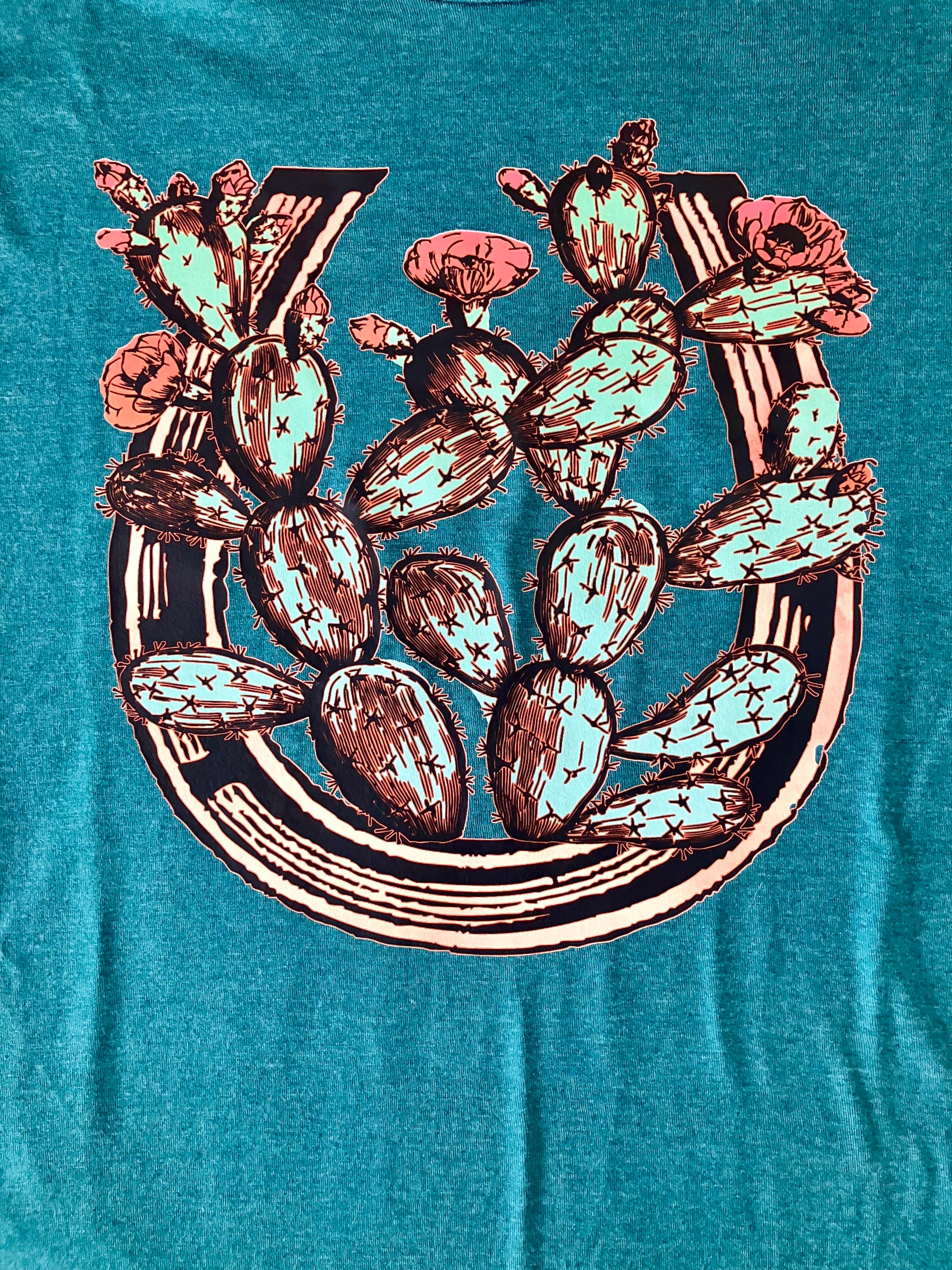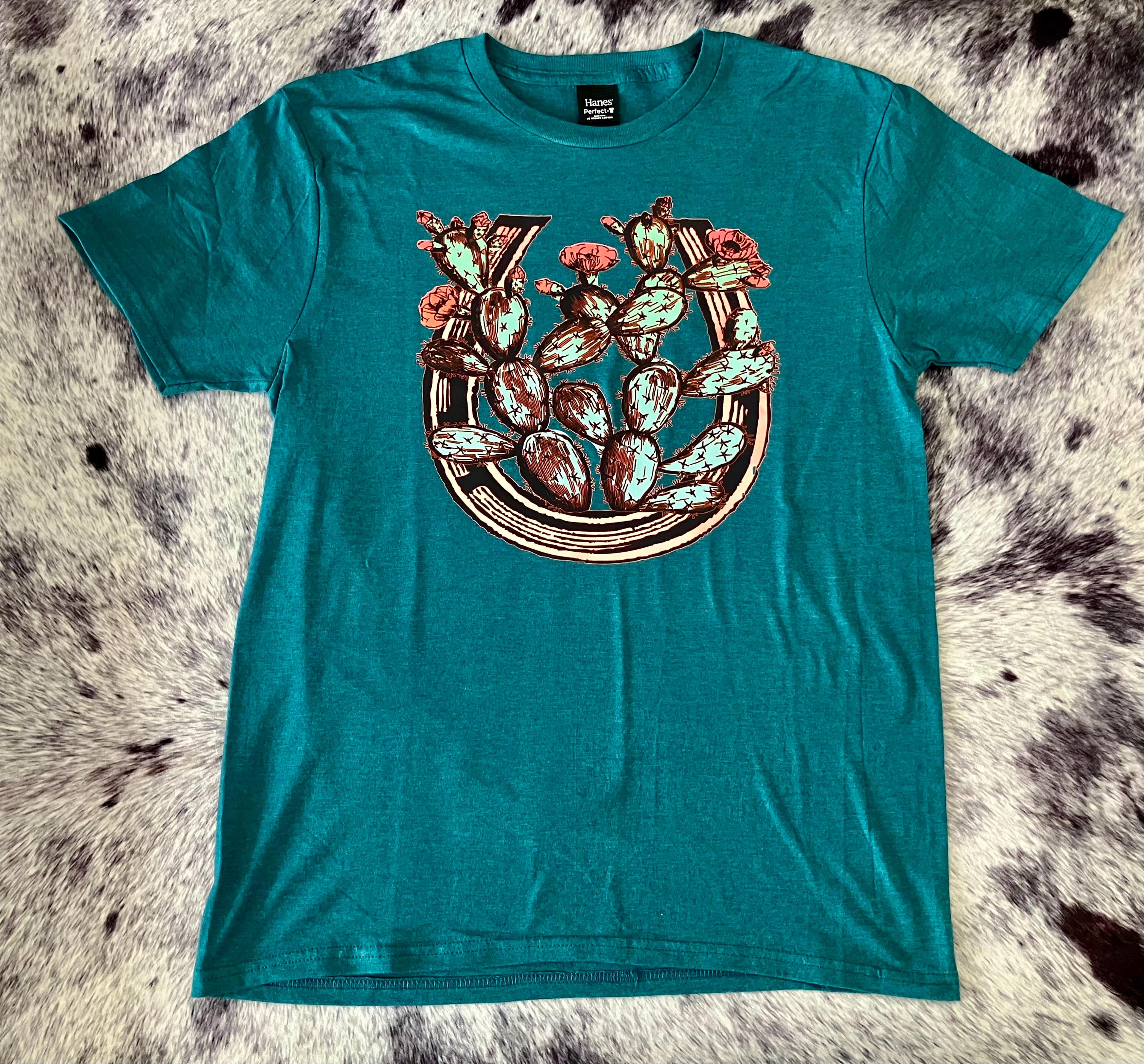 This western graphic tee features a unique cactus design that blends cowboy tradition with desert inspired style. Printed on a rich turquoise tee, this shirt makes a statement while still being easy to wear day to day.