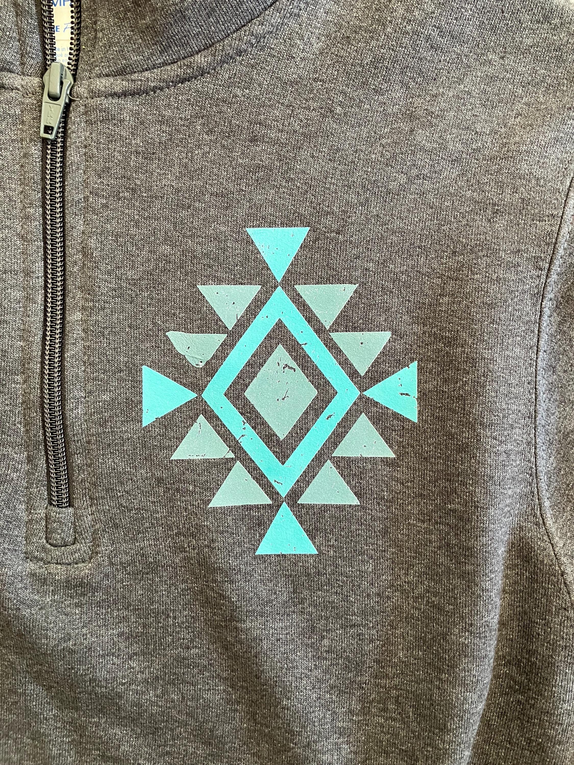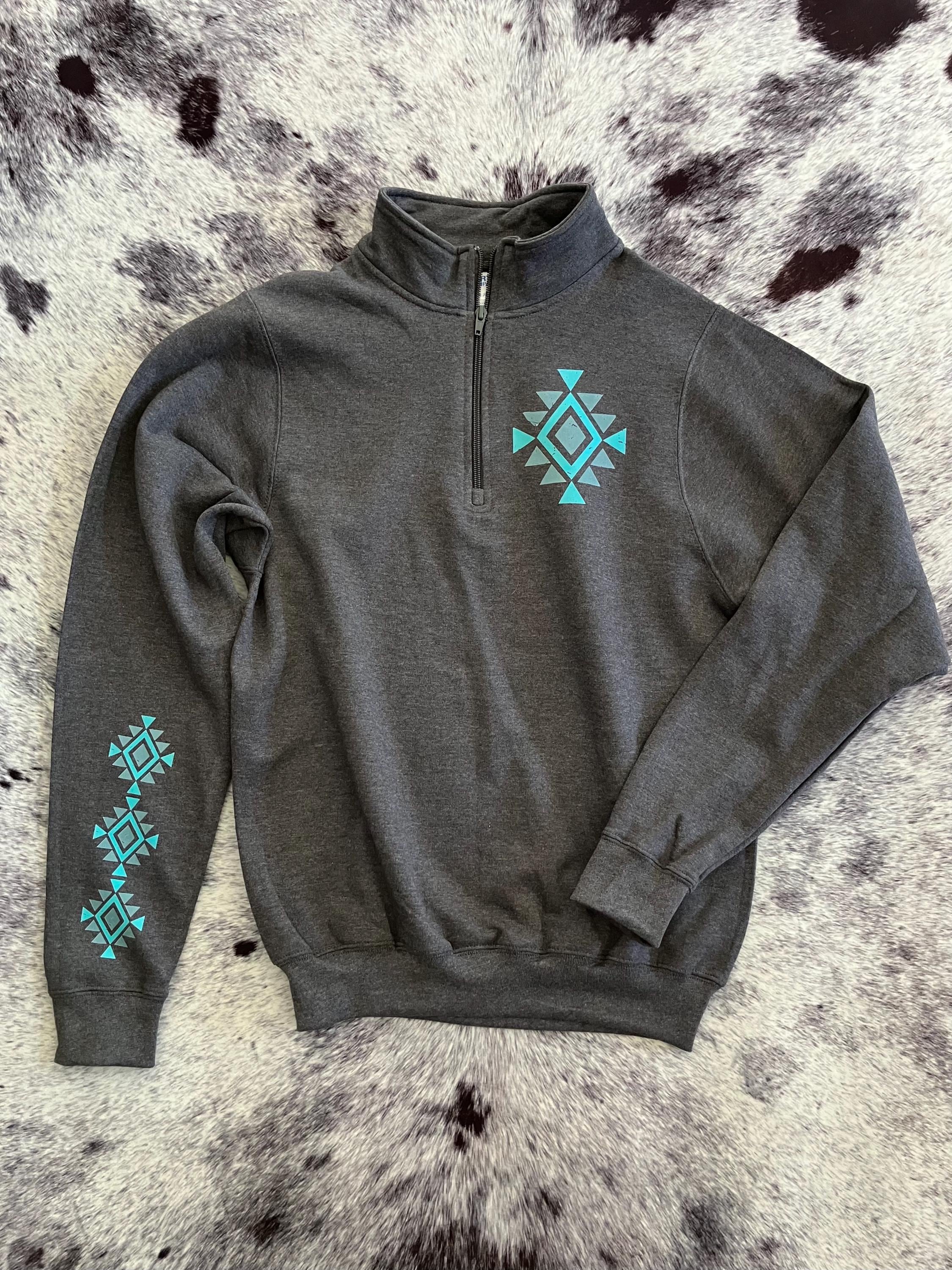 This charcoal grey quarter zip features a striking turquoise Aztec pattern that adds the perfect pop of color while staying neutral and easy to wear. Made for comfort and everyday western style, it’s perfect for chilly mornings at the barn, long days at jackpots, or casual nights out.