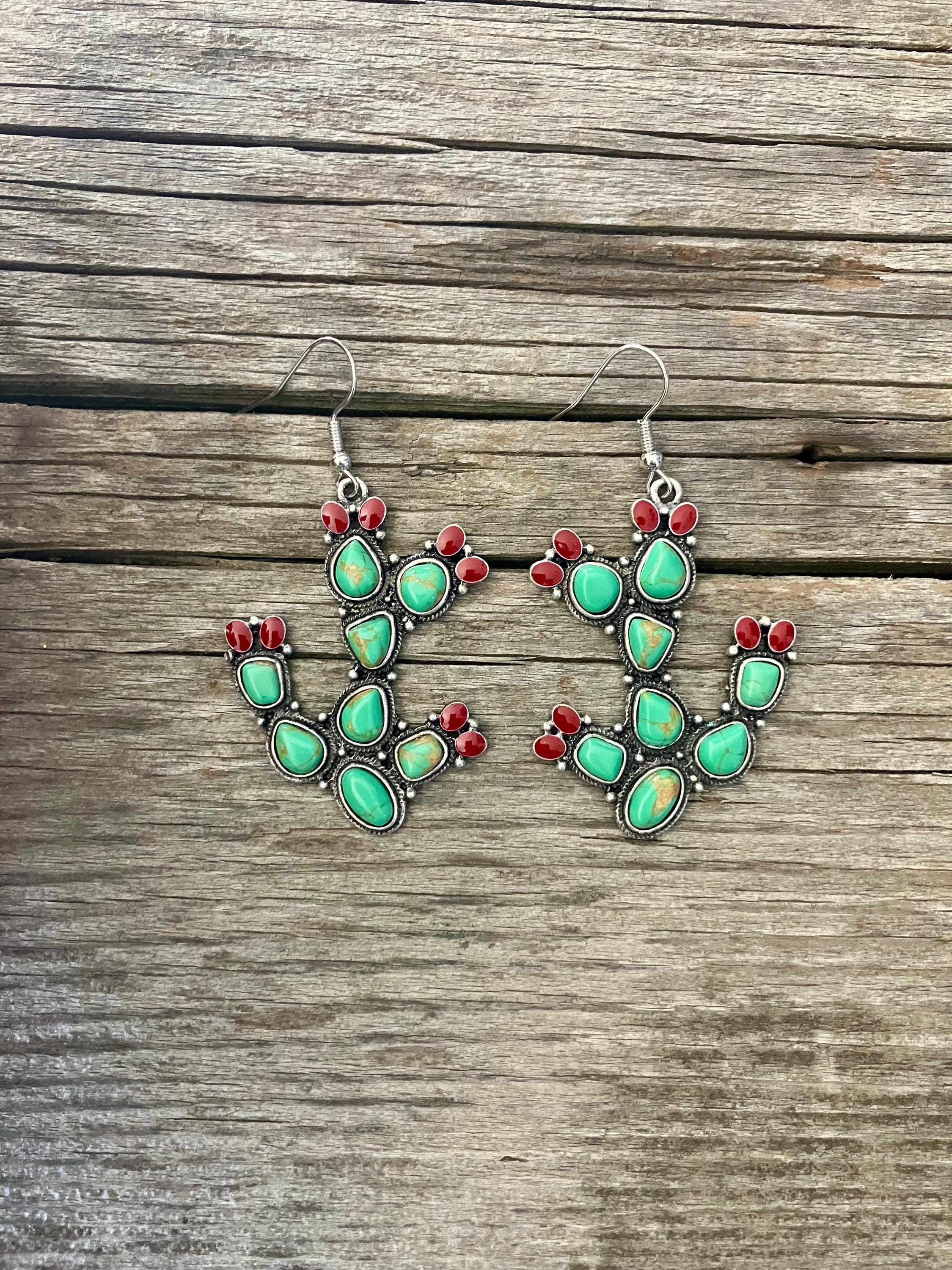 These turquoise colored cactus earrings feature a striking cactus silhouette accented with vibrant turquoise look stones and rich red stone details. Finished with an oxidized silver-tone setting, these earrings bring together classic western style and southwestern flair without being over the top.
