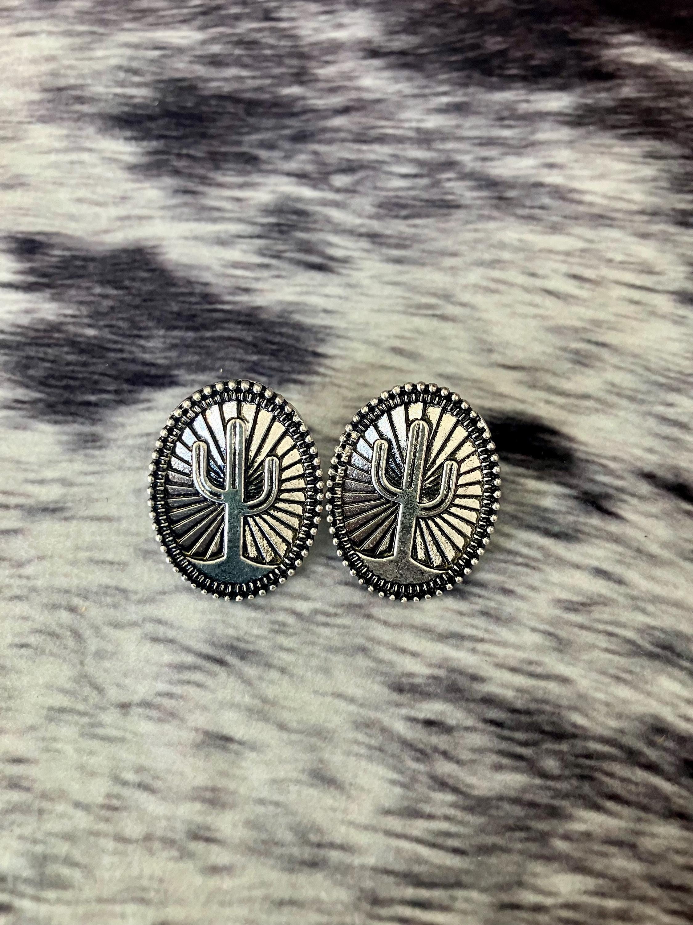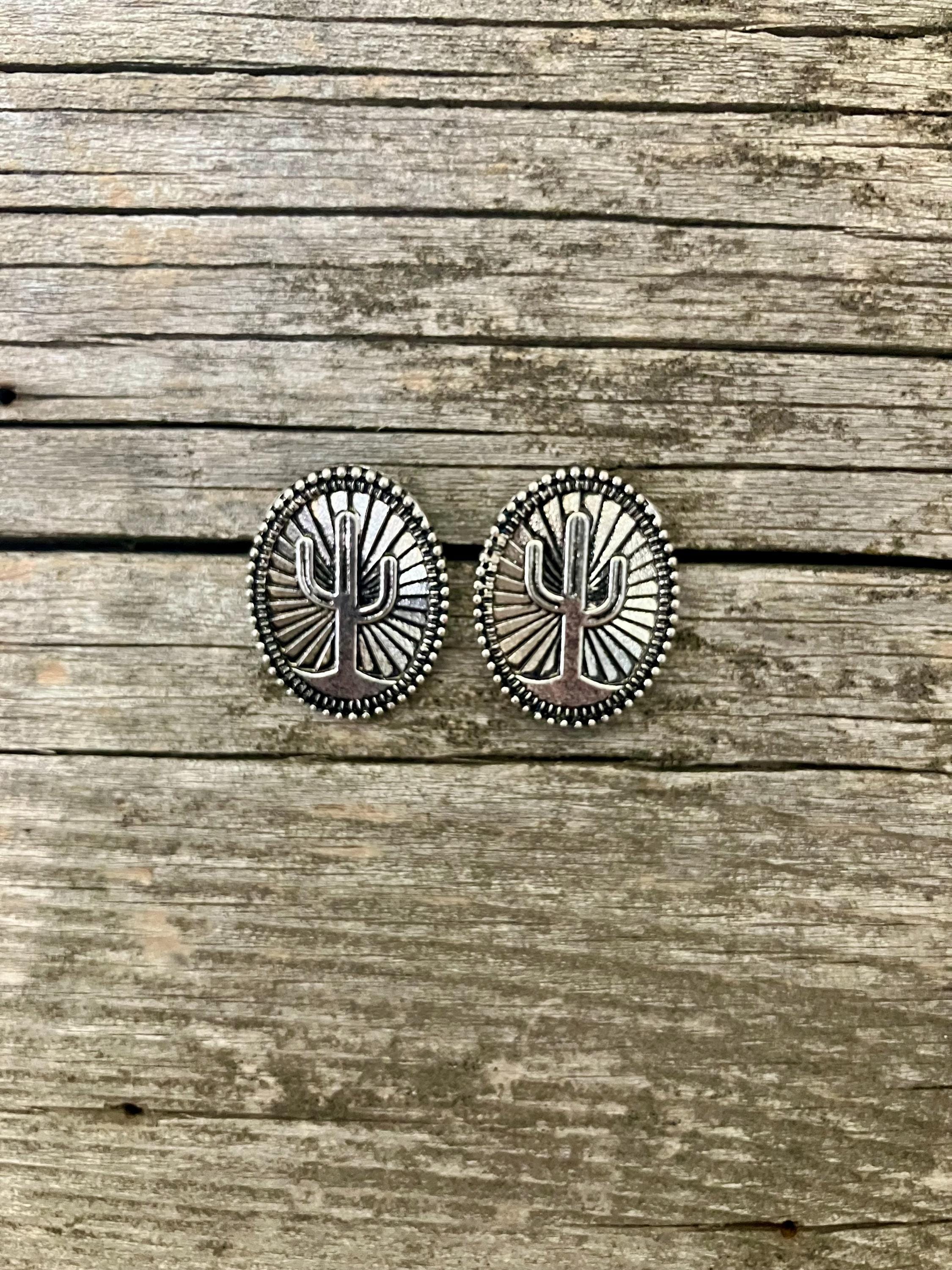 These silver tone cactus stud earrings feature an oval shape with a stamped sunburst style background and raised cactus detail.