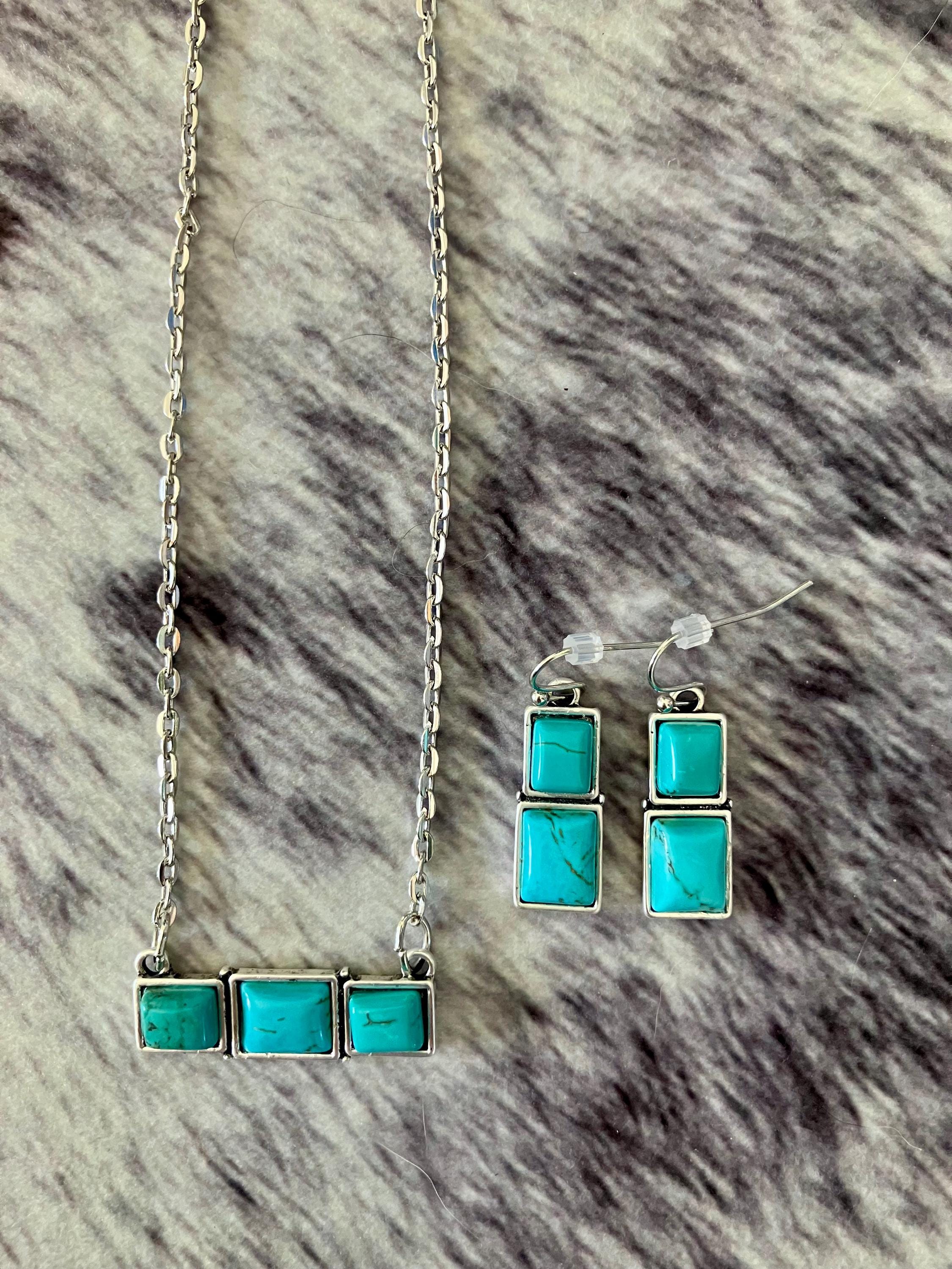 Complete your western outfit with this faux-turquoise necklace and earring jewelry set. Featuring three turquoise stones on a silver tone bar pendant paired with matching double-stone faux turquoise earrings.