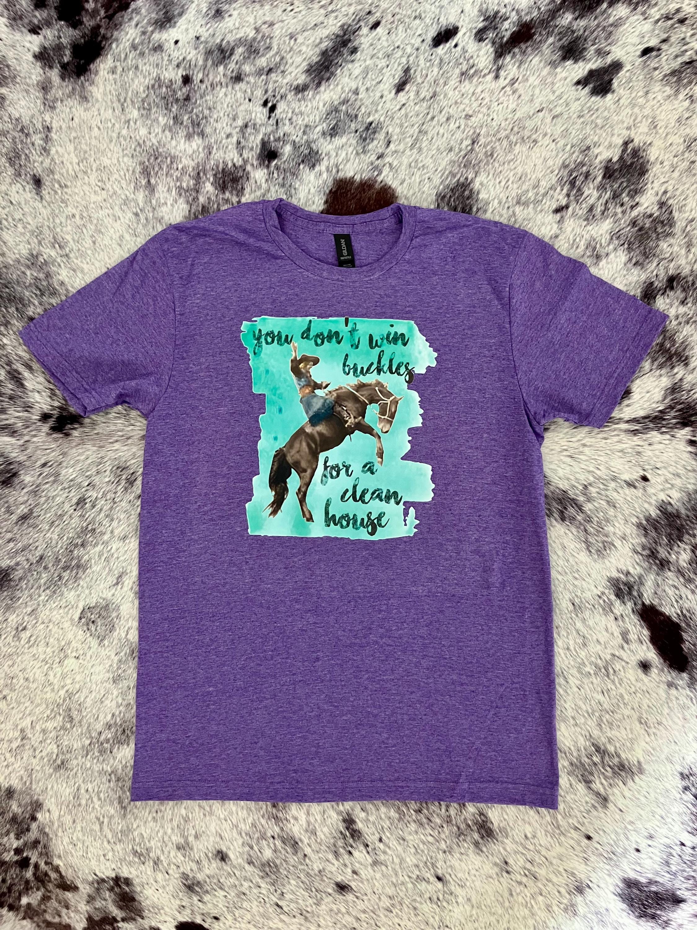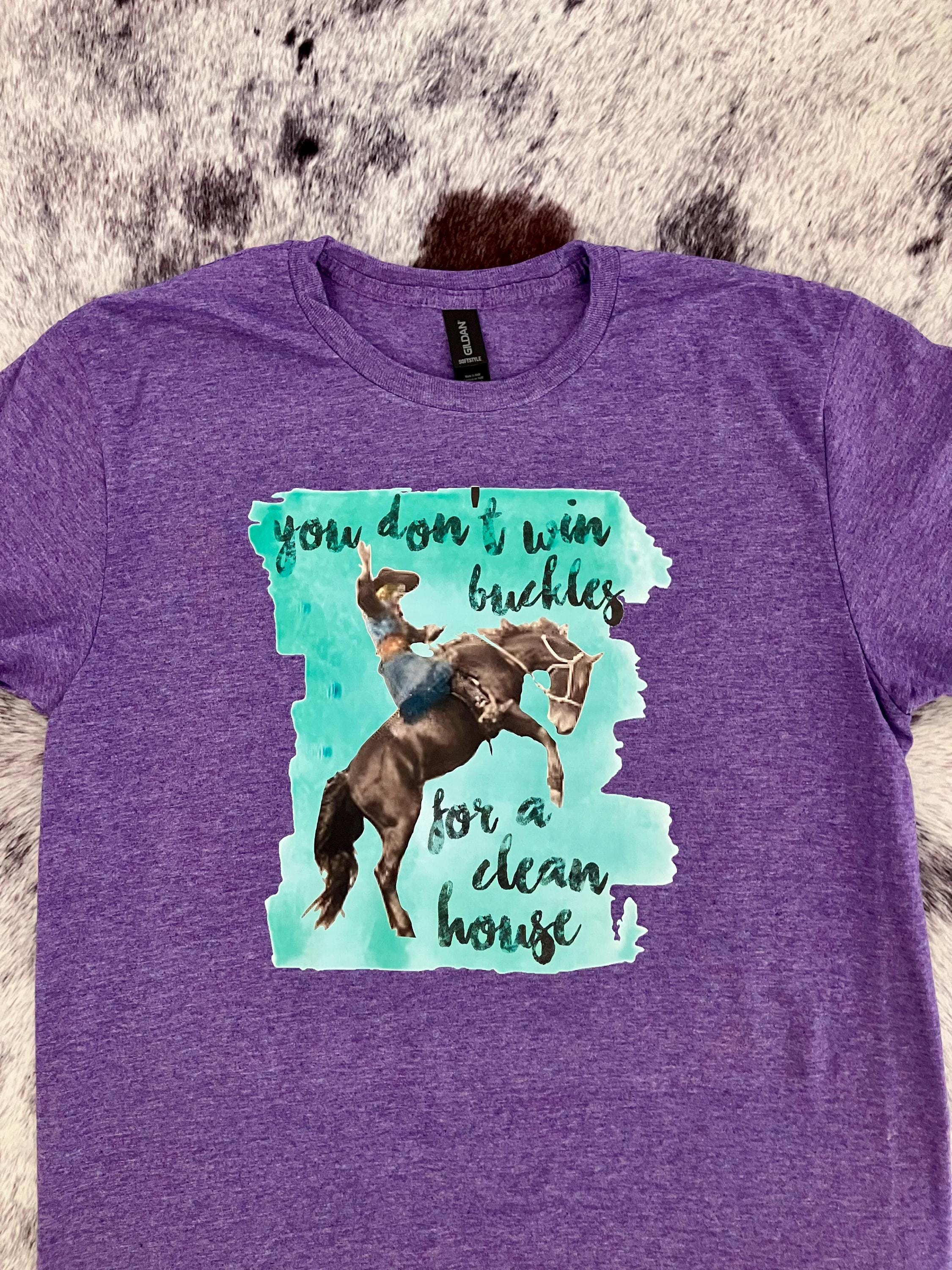 This “You Don’t Win Buckles for a Clean House” tee is made for the cowgirls who’d rather be at the arena than worrying about the dishes. Featuring a bold bronc rider graphic with a turquoise paint-style background on a vibrant purple tee, this one is guaranteed to get laughs and compliments.